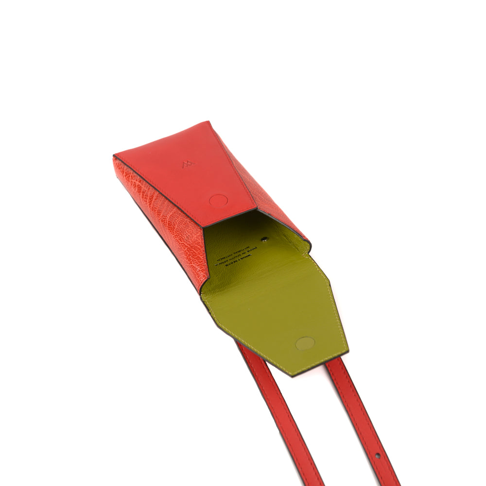 Introducing the ultimate accessory for the modern woman on-the-go- our luxury leather small bag is designed to be the perfect companion for your phone. With its compact size, this small bag is perfect for carrying your phone, cash, and other small essentials without the hassle of a bulky purse or bag Whether you're running errands or heading for a night out, this small purse is the perfect accessory to keep your essentials close at hand whilst boasting a sophisticated design that exudes elegance and style. Details: magnetic front closure, long adjustable strap Colour: Exotica Length: 16.5cm Width: 2cm Height: 8cm Strap: 110cm Leather: African ostrich