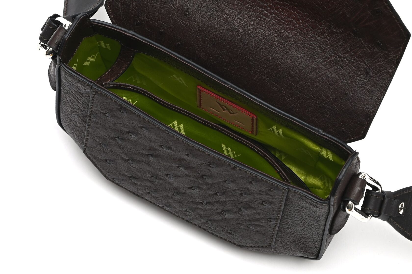 This design is the epitome of understated elegance and sophistication, this small yet stylish bag is designed to elevate every outfit. This bag is versatile enough to be worn over the shoulder or as a crossbody bag. The bottom studs provide stability and protection for your bag, ensuring it stays in pristine condition for years to come. Whether you're running errands, going out with friends or heading to a special event, this luxury handbag is the perfect accessory to complement your style and elevate your look. Details: removable and adjustable link strap, magnetic front closure Color: Dark Brown Length: 19.5 cm Width: 8 cm Height: 14 cm Bag strap: 45 cm Leather: African ostrich quill Inside: one compartment with open slash pocket, key finder