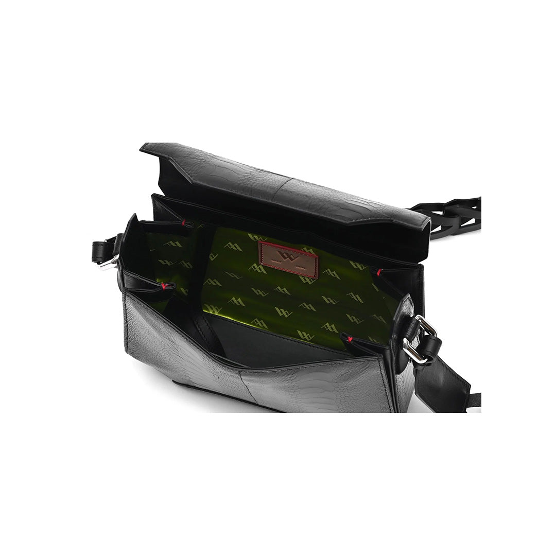 This handbag features a structured and small silhouette, making it perfect for any occasion, whether it be a formal event or a casual outing. It can be worn comfortably over your shoulder or across your body, ensuring versatility in your styling options. The signature Winklmayr gussets add a touch of elegance and uniqueness to the design. The simple shape and structured design give it a classic and timeless appeal, making it a must-have accessory for any wardrobe. Details: removable and adjustable link strap, magnetic top closure Color: black Length: 20 cm Width: 8 cm Height: 14 cm Bag strap: 45 cm Leather: African ostrich leg Inside: one compartment, open slip pocket, protective bottom studs
