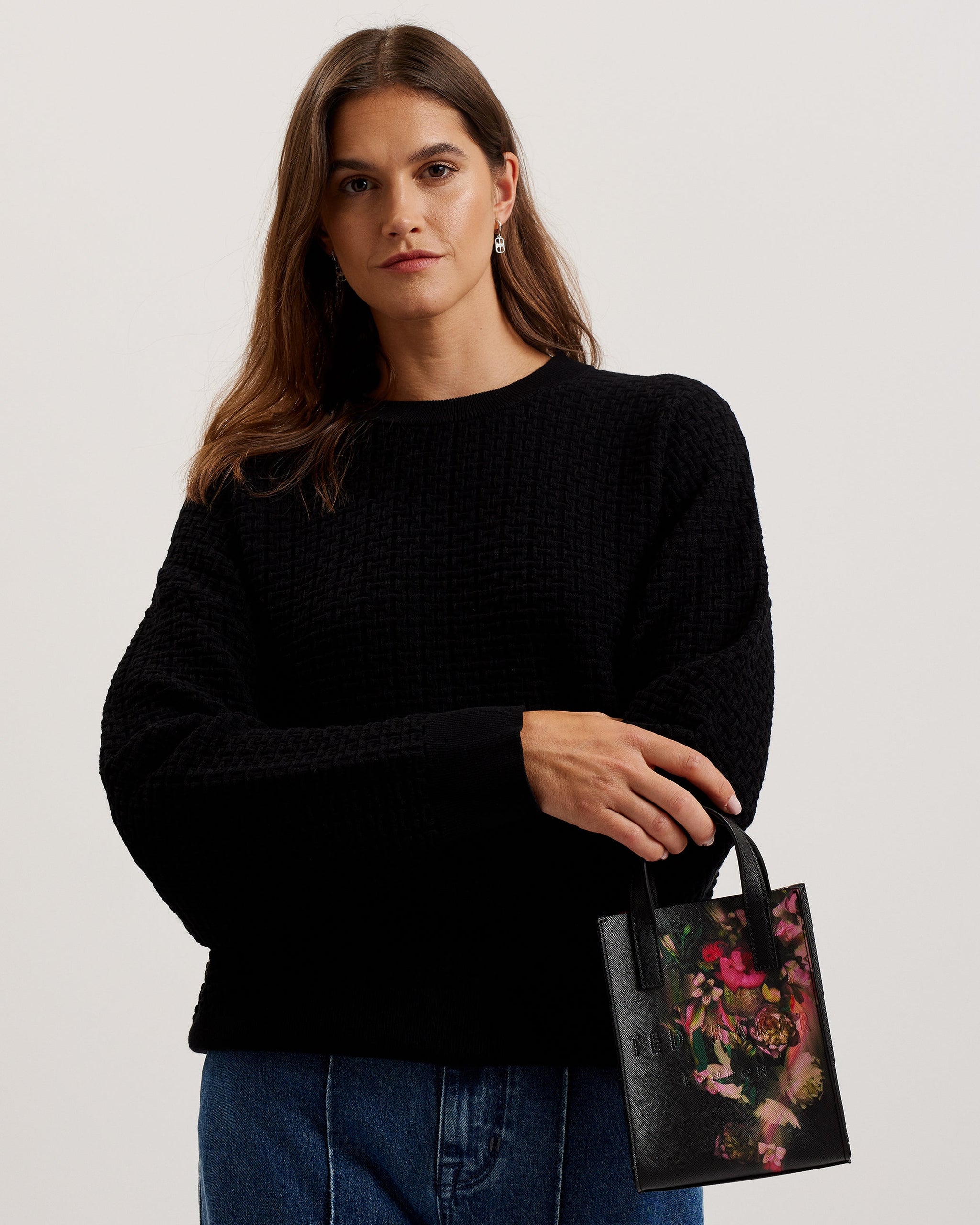 Designed with an eye-catching floral pattern of pink peonies and alstroemeria blooms with luscious green details, the background of this bag is black, allowing the flora to stand out. Made with a polyurethane exterior, this bag is easy to wipe down making it ideal for everyday use. The bag features two top handles for carrying or attach the adjustable shoulder strap with the clips to carry it as a crossbody, making this small bag super versatile. Inside is a bold pink lining which contrasts beautifully against the dark exterior. This mini icon bag is perfect for your phone, purse and a few essentials such as makeup and your keys. The Ted Baker logo is embossed on the outside which creates a striking look.